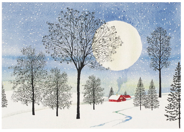 A bright full moon illuminates a watercolor sky above a cozy red cottage and a peaceful winter wood.